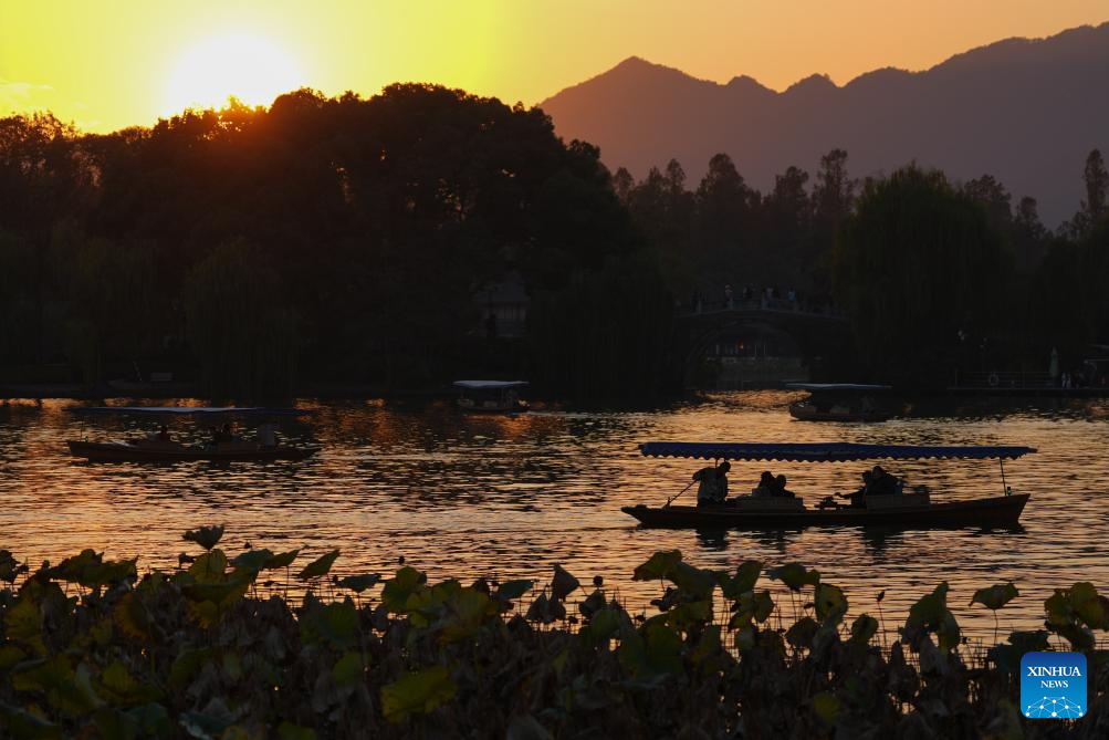 This photo shows the West Lake scenic area at sunset in Hangzhou, east China's Zhejiang Province, Nov. 20, 2025. (Xinhua/Huang Zongzhi)