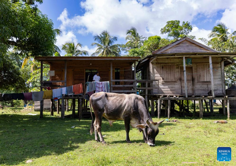 This photo taken on Nov. 19, 2025 shows a cow grazing in front of a house in Karata, the North Caribbean Coast Autonomous Region, Nicaragua. Karata, an indigenous community in the North Caribbean Coast Autonomous Region of Nicaragua, is inhabited mainly by the Miskito people. Surrounded by the Caribbean Sea, lagoons, and mangroves, the community is accessible mainly by boat. (Xinhua/Li Mengxin)