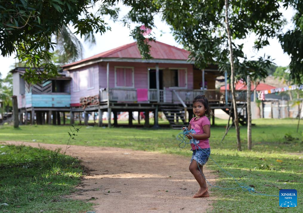 A child plays in front of a house in Tuapi, the North Caribbean Coast Autonomous Region, Nicaragua, on Nov. 19, 2025. Tuapi, an indigenous community in the North Caribbean Coast Autonomous Region of Nicaragua, is home mainly to Miskito residents. Located near the Caribbean Sea, the community relies primarily on fishing and livestock farming. (Xinhua/Li Mengxin)