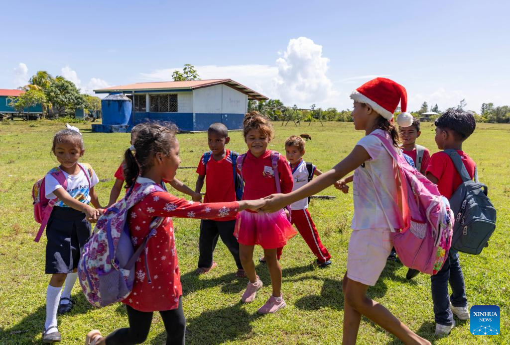 Students play games at school in Karata, the North Caribbean Coast Autonomous Region, Nicaragua, Nov. 19, 2025. Karata, an indigenous community in the North Caribbean Coast Autonomous Region of Nicaragua, is inhabited mainly by the Miskito people. Surrounded by the Caribbean Sea, lagoons, and mangroves, the community is accessible mainly by boat. (Xinhua/Li Mengxin)
