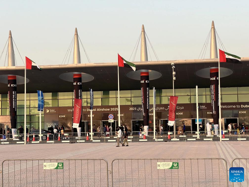 People visit the Dubai Air Show where air performances have resumed after being suspended due to an Indian aircraft crash in Dubai, the United Arab Emirates (UAE), Nov. 21, 2025. An Indian aircraft crashed on Friday during a demonstration at the Dubai Air Show, killing the pilot.