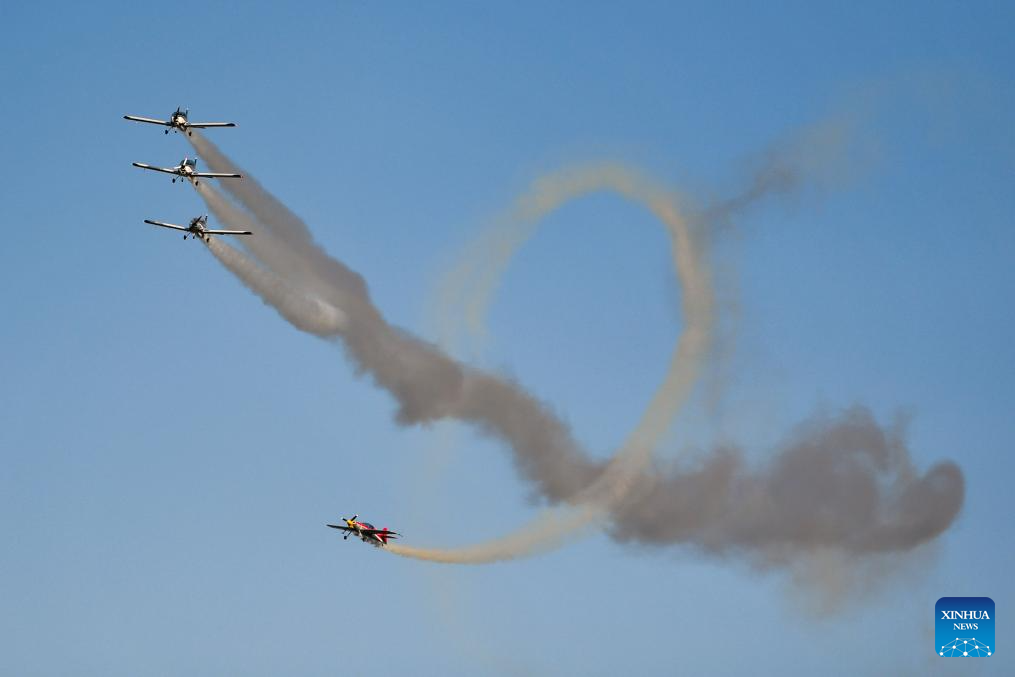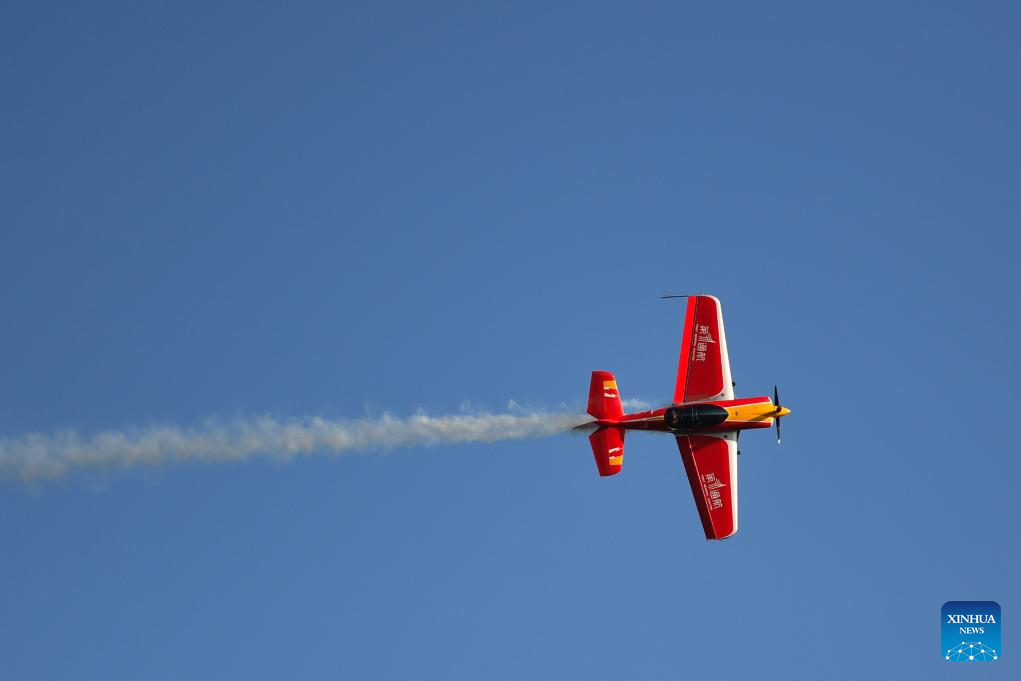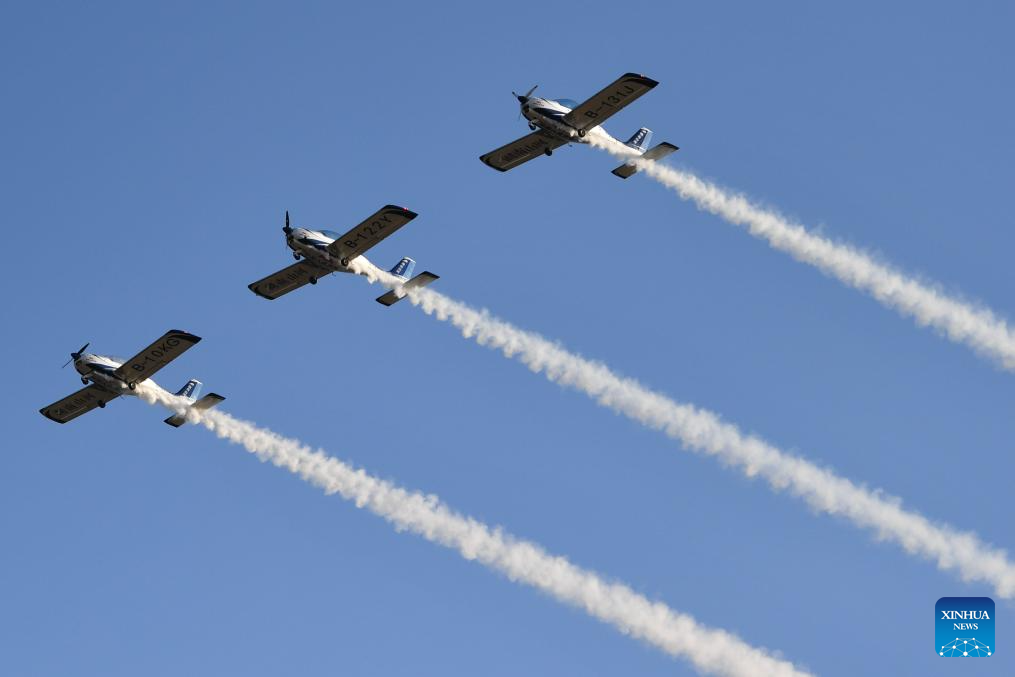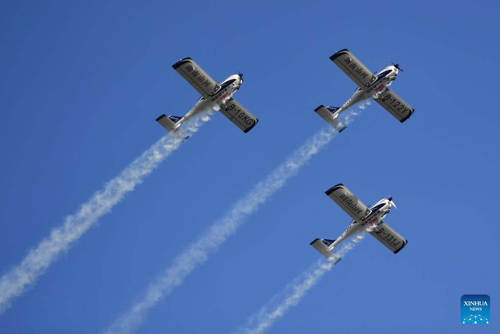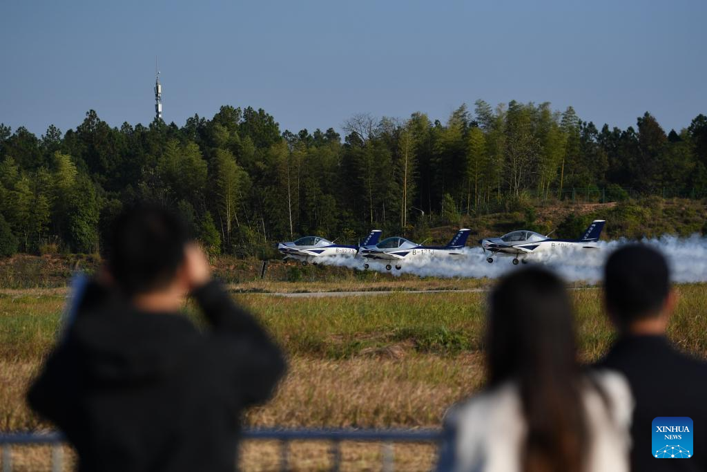 This photo taken on Nov. 21, 2025 shows an air show during the 2025 Hunan International General Aviation and Low Altitude Economy Industry Expo at the Lusong Airport of Zhuzhou City, central China's Hunan Province. The expo comprises a static exhibition at the Changsha International Convention and Exhibition Center in Changsha and an air show at the Lusong Airport of Zhuzhou City, both in central China's Hunan Province. (Xinhua/Chen Zhenhai)