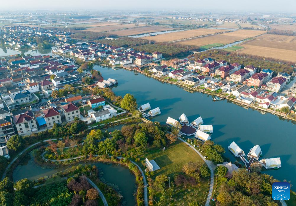 An aerial drone photo taken on Nov. 21, 2025 shows people posing for photos at a waterfront homestay in Chenyang Village of Xinghua, east China's Jiangsu Province. Local authorities in Xinghua have sought to embed environmental construction into the rural industry landscape in recent years, helping create numerous villages that are both livable and suitable for business operations. (Photo by Shi Daozhi/Xinhua)