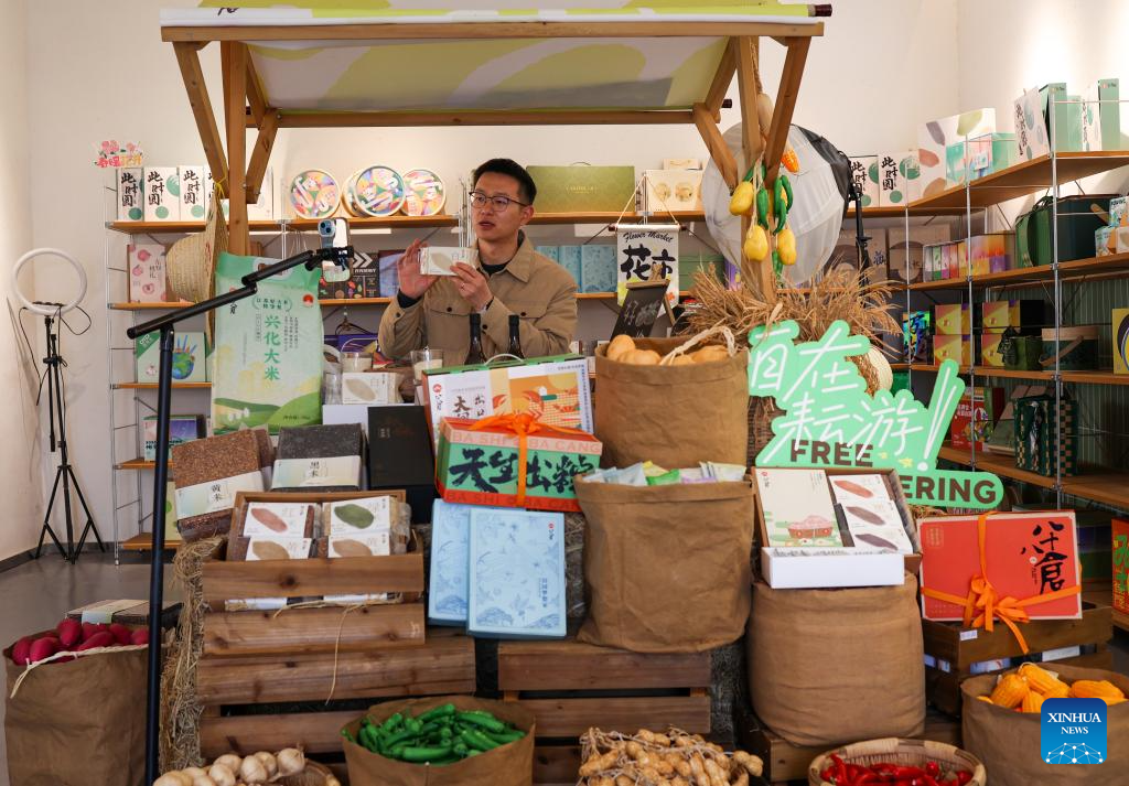 A man promotes rural specialty agricultural products via live-streaming in Dongluo Village of Xinghua, east China's Jiangsu Province, Nov. 21, 2025. Local authorities in Xinghua have sought to embed environmental construction into the rural industry landscape in recent years, helping create numerous villages that are both livable and suitable for business operations. (Photo by Shi Daozhi/Xinhua)