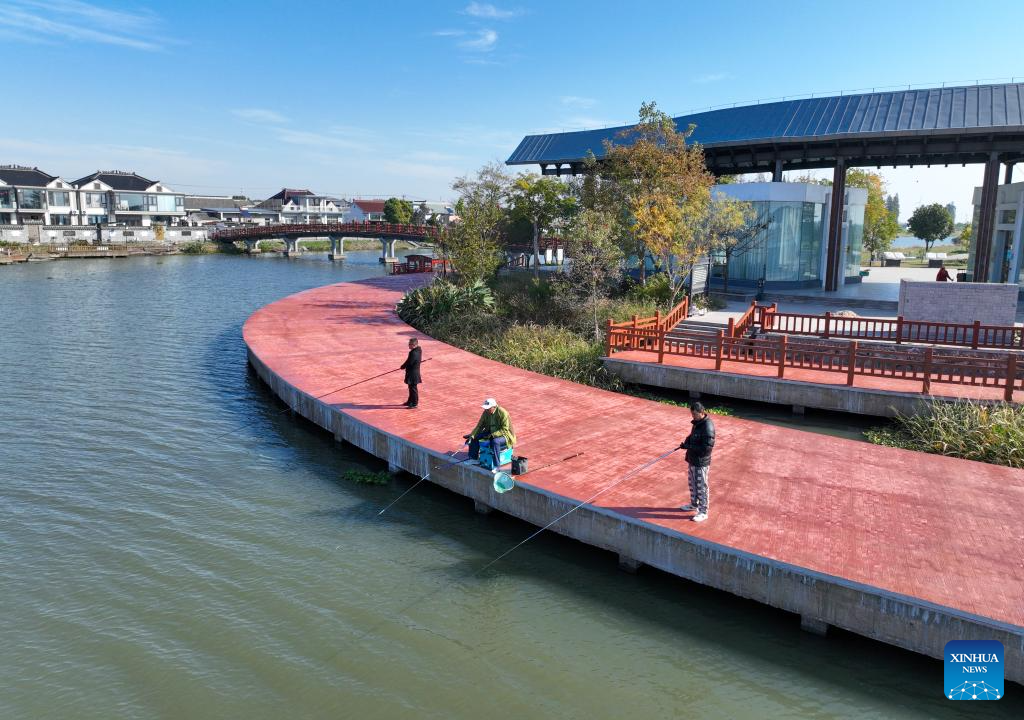 An aerial drone photo taken on Nov. 21, 2025 shows villagers fishing by a river in Liuze Village of Xinghua, east China's Jiangsu Province. Local authorities in Xinghua have sought to embed environmental construction into the rural industry landscape in recent years, helping create numerous villages that are both livable and suitable for business operations. (Photo by Shi Daozhi/Xinhua)