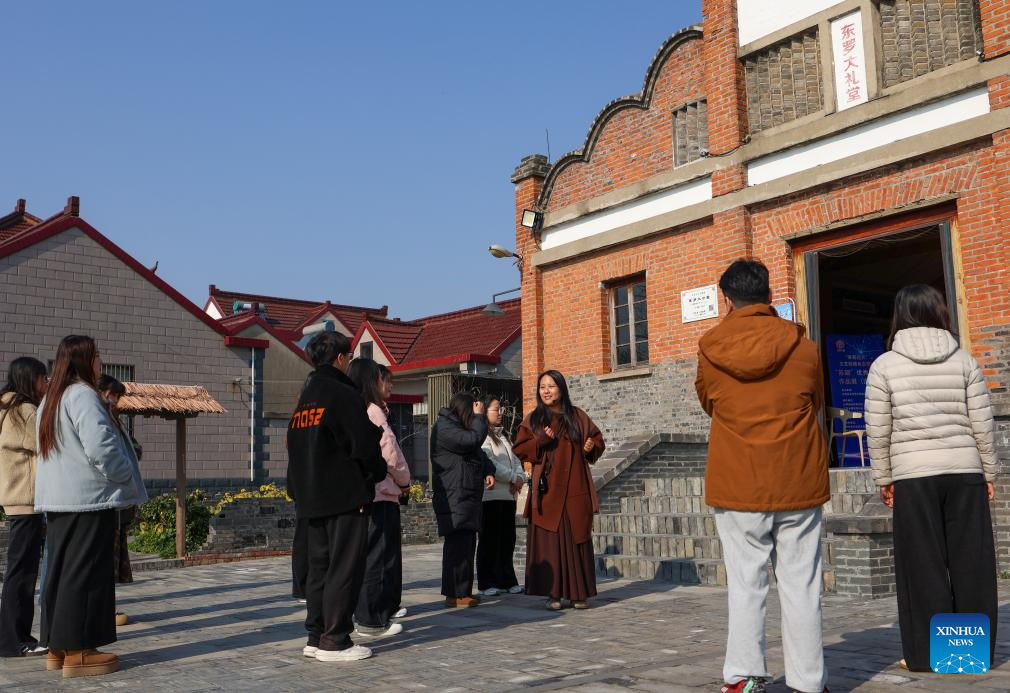 Tourists visit the Dongluo Village, which has been listed in the UN Tourism's 2025 edition of "Best Tourism Villages," with a local tour guide (3rd R) in Xinghua, east China's Jiangsu Province, Nov. 21, 2025. Local authorities in Xinghua have sought to embed environmental construction into the rural industry landscape in recent years, helping create numerous villages that are both livable and suitable for business operations. (Photo by Shi Daozhi/Xinhua)