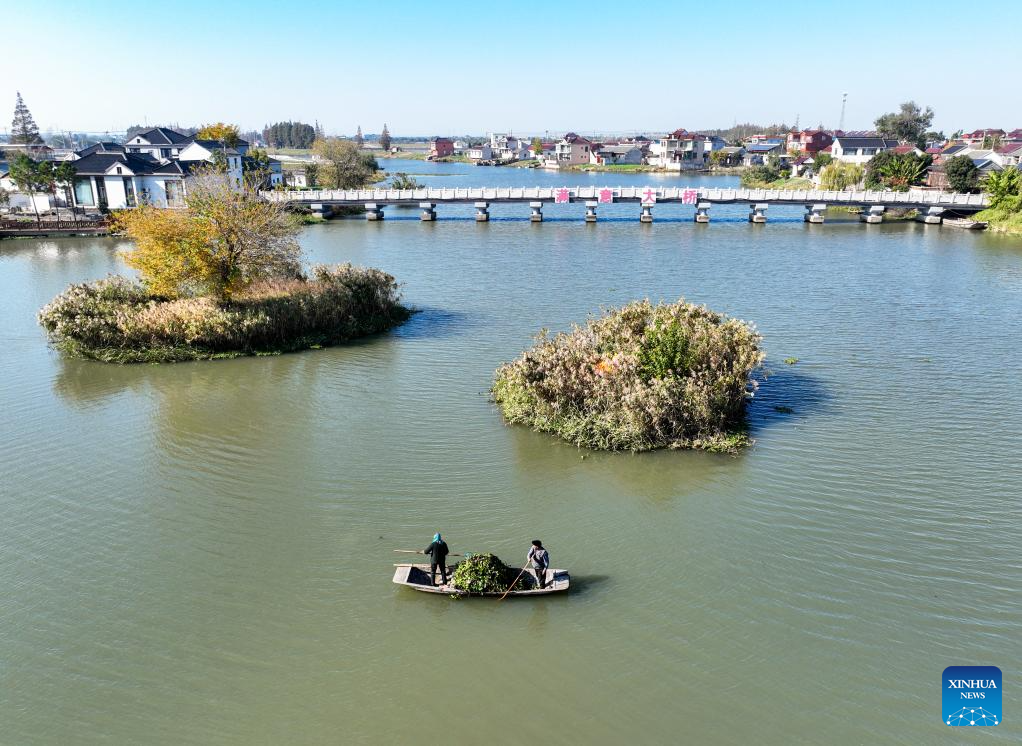 An aerial drone photo taken on Nov. 21, 2025 shows villagers cleaning floats from a waterway in Liuze Village of Xinghua, east China's Jiangsu Province. Local authorities in Xinghua have sought to embed environmental construction into the rural industry landscape in recent years, helping create numerous villages that are both livable and suitable for business operations. (Photo by Shi Daozhi/Xinhua)