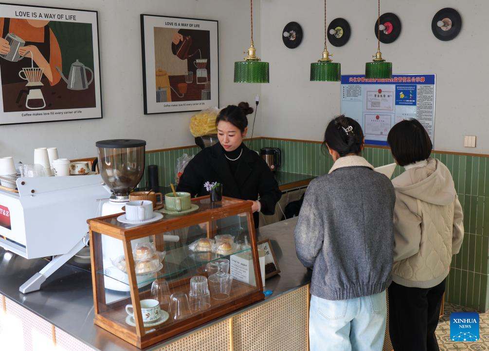 Gao Qingying (L), a cafe owner who has returned from Shanghai to start a business at home, serves customers in Dongluo Village of Xinghua, east China's Jiangsu Province, Nov. 21, 2025. Local authorities in Xinghua have sought to embed environmental construction into the rural industry landscape in recent years, helping create numerous villages that are both livable and suitable for business operations. (Photo by Shi Daozhi/Xinhua)