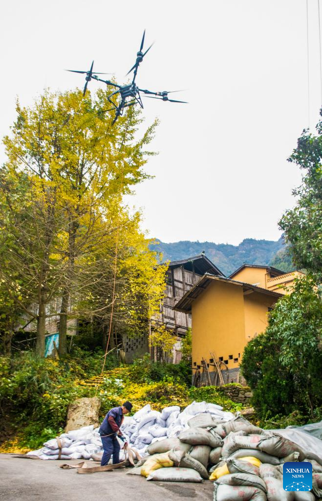 A farmer operates a drone to transport fertilizer to a sealwort field, a kind of traditional Chinese herb, in Zhongyi Township, Shizhu County, southwest China's Chongqing, Nov. 22, 2025. Located in Wuling Mountain area, Zhongyi Township in recent years has developed several characteristic industries so as to build a modern agricultural industrial system.