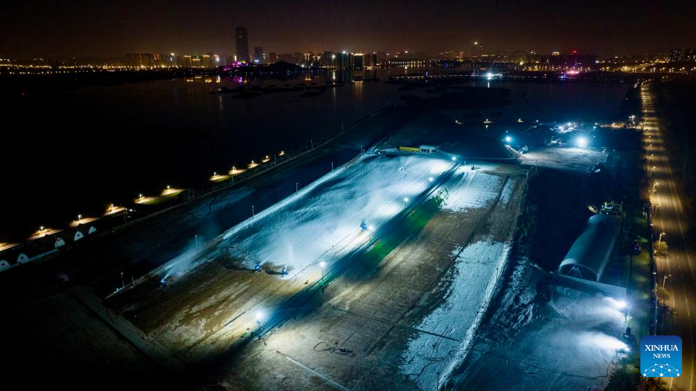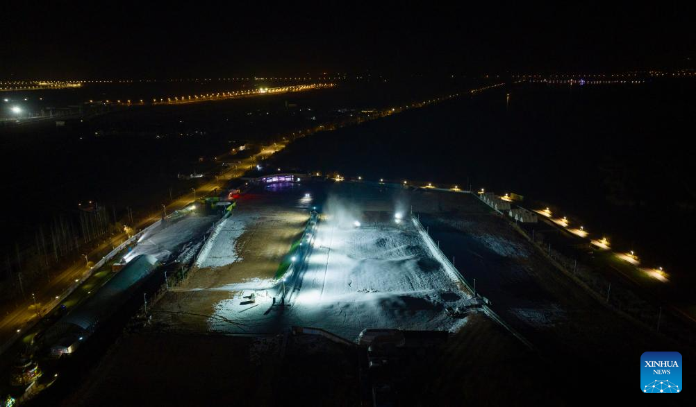A drone photo taken on Nov. 22, 2025 shows staff members making artificial snow at Yuehai ski resort in Yinchuan, northwest China's Ningxia Hui Autonomous Region. As the nighttime temperature continuously drops in Yinchuan, ski resorts in the city are busy shaping snow trails, debugging equipment, and making artificial snow, in preparation for the upcoming season of ice and snow tourism.