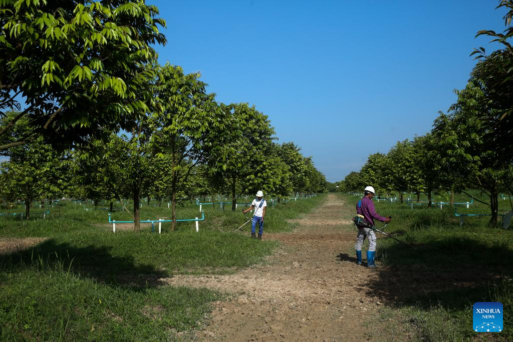 Workers operate at a durian orchard on the outskirts of Yangon, Myanmar, Nov. 15, 2025.(Xinhua/Myo Kyaw Soe)