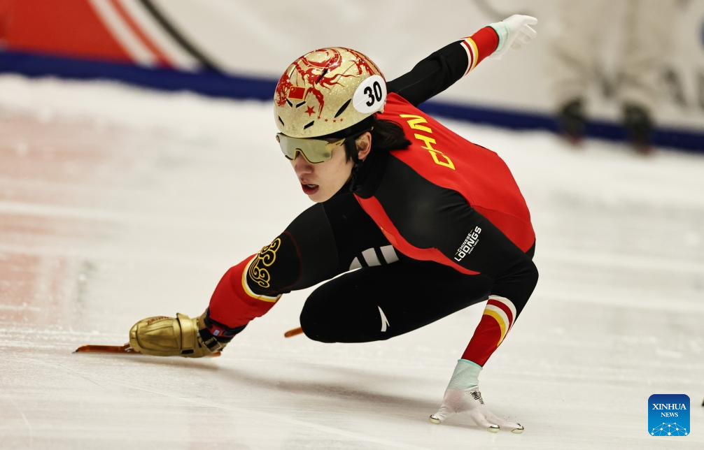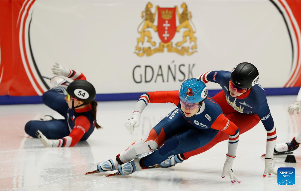 Fan Kexin of China competes during the mixed team relay semifinal at the ISU Short Track World Tour #3 speed skating event in Gdansk, Poland, Nov. 21, 2025. (Xinhua/Gao Jing)