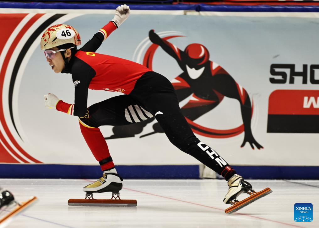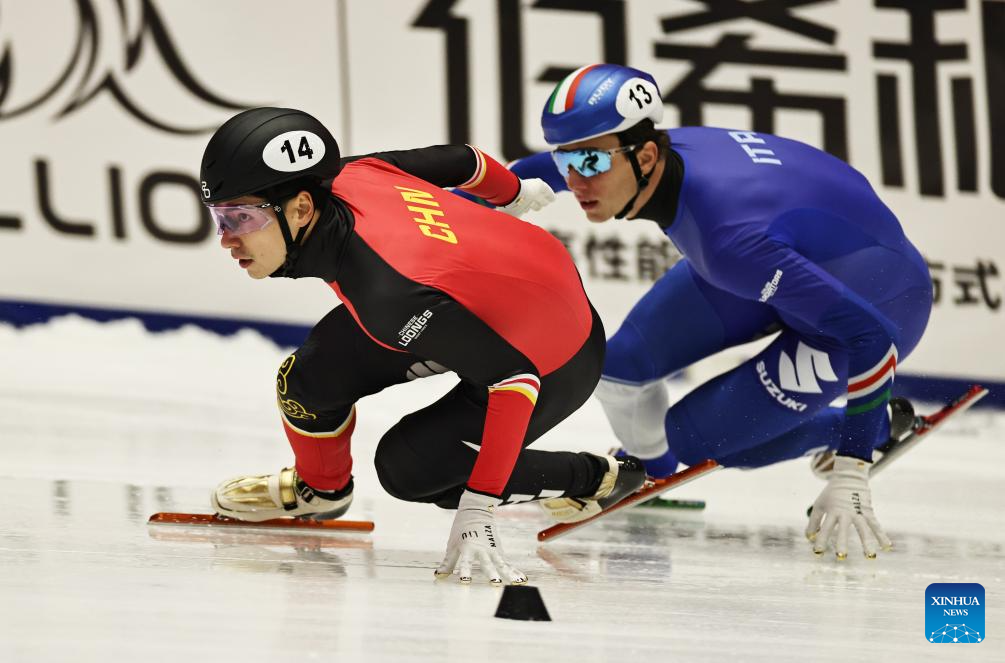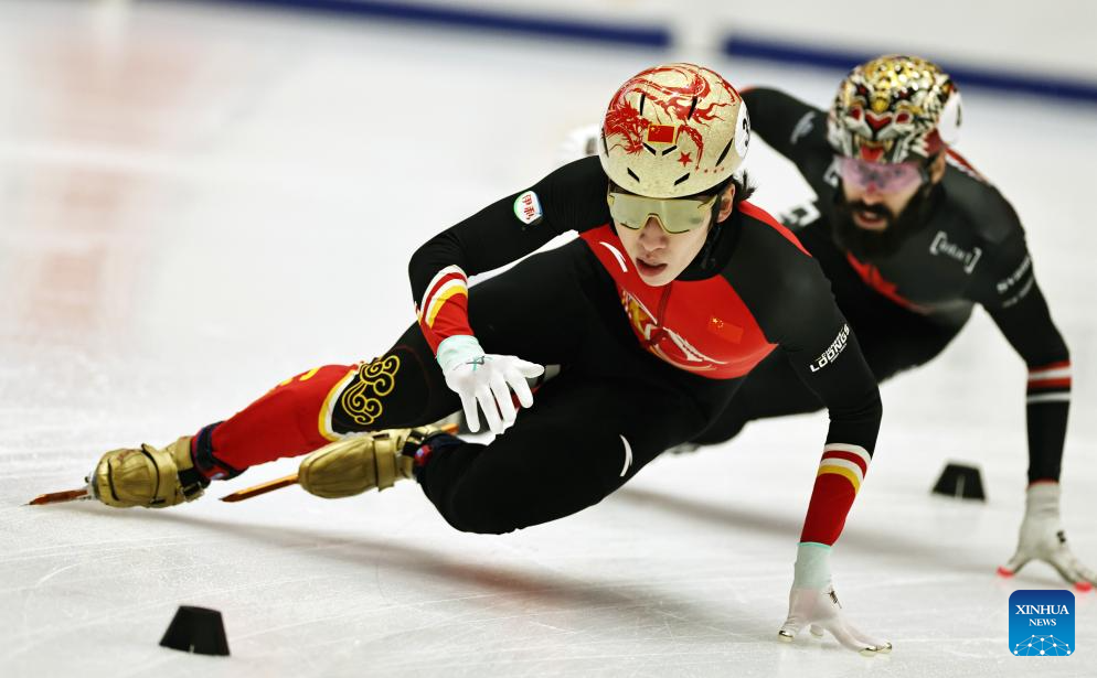 Lin Xiaojun of China competes during the mixed team relay semifinal at the ISU Short Track World Tour #3 speed skating event in Gdansk, Poland, Nov. 21, 2025. (Xinhua/Gao Jing)