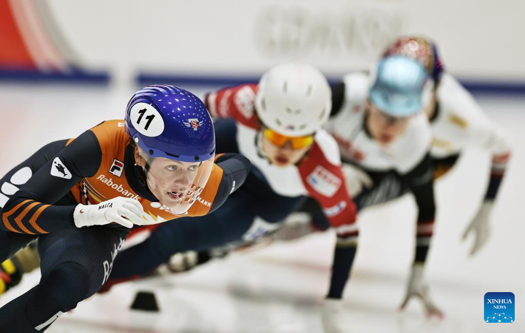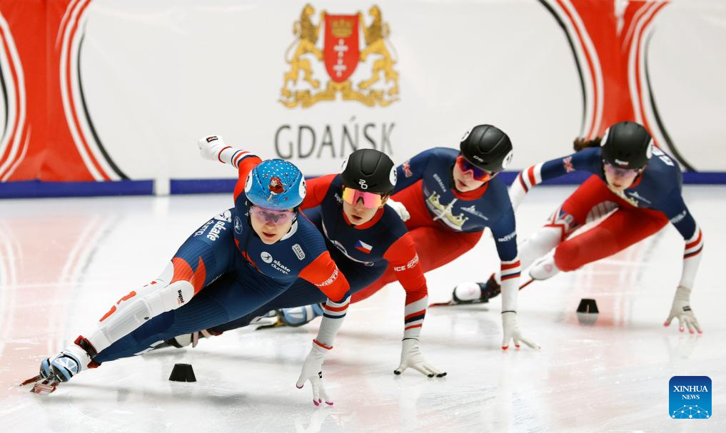 Michelle Velzeboer (L) of the Netherlands competes during the mixed team relay semifinal at the ISU Short Track World Tour #3 speed skating event in Gdansk, Poland, Nov. 21, 2025. (Xinhua/Gao Jing)
