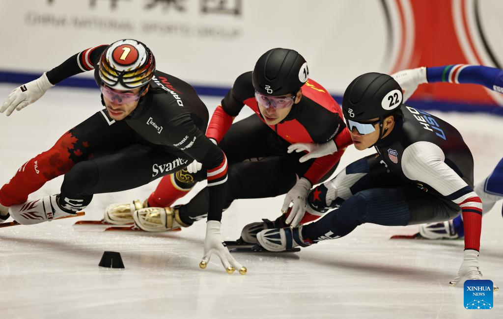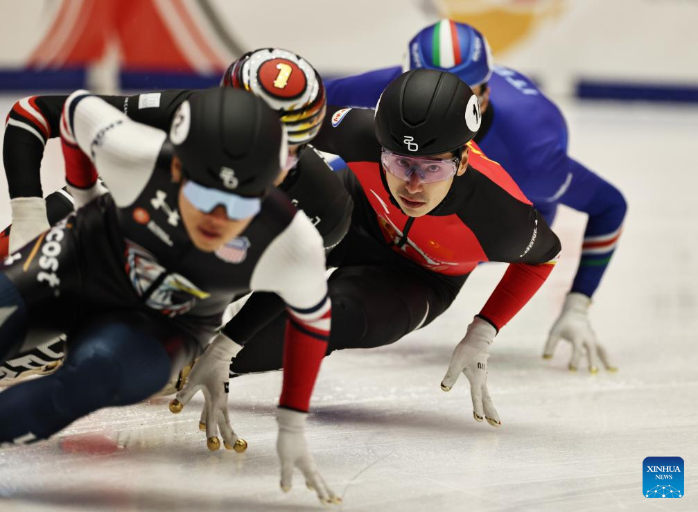 Liu Shaoang (C) of China competes during the mixed team relay semifinal at the ISU Short Track World Tour #3 speed skating event in Gdansk, Poland, Nov. 21, 2025. (Xinhua/Gao Jing)