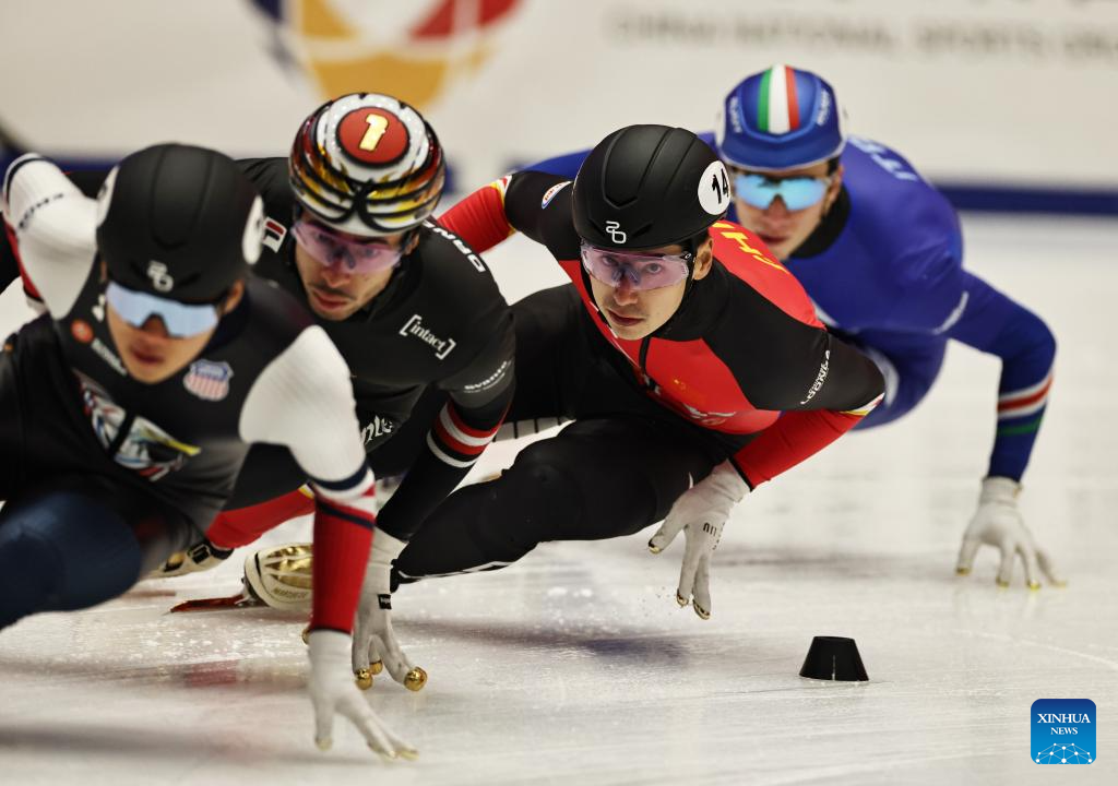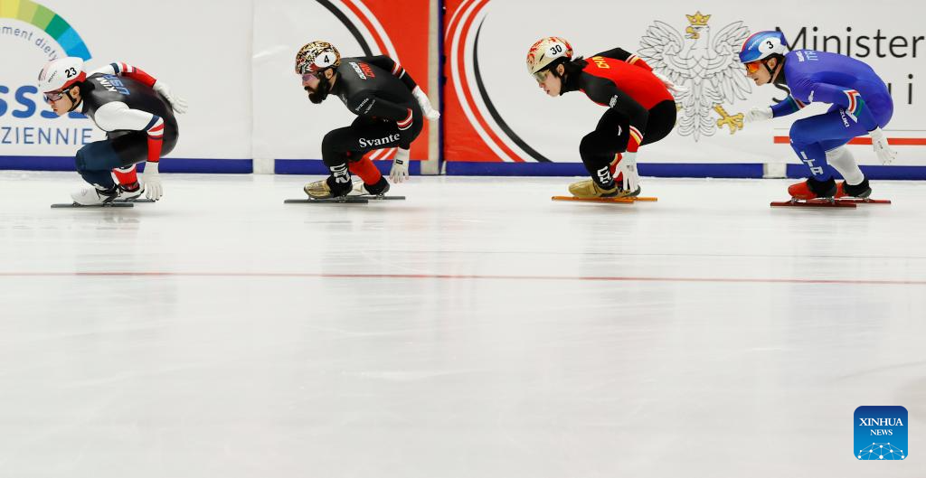 Liu Shaoang (2nd R) of China competes during the mixed team relay semifinal at the ISU Short Track World Tour #3 speed skating event in Gdansk, Poland, Nov. 21, 2025. (Xinhua/Gao Jing)