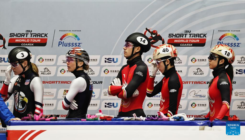 Members of Team China (R) react before the mixed team relay semifinal at the ISU Short Track World Tour #3 speed skating event in Gdansk, Poland, Nov. 21, 2025. (Xinhua/Gao Jing)