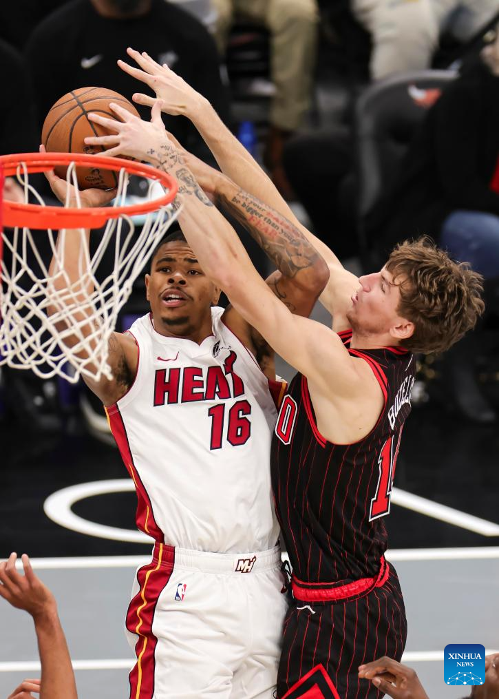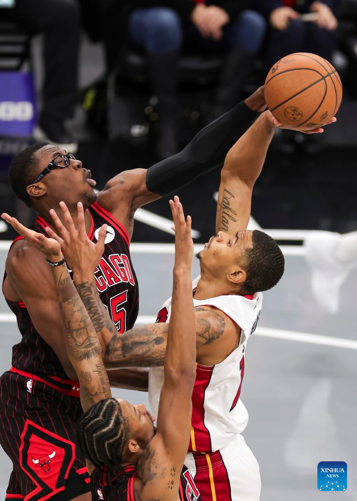 (251122) -- CHICAGO, Nov. 22, 2025 (Xinhua) -- Jalen Smith (L) of Chicago Bulls blocks the shot of Kel'El Ware of Miami Heat during the 2025-2026 NBA Cup group match between Chicago Bulls and Miami Heat in Chicago, the United States, on Nov. 21, 2025. (Photo by Joel Lerner/Xinhua)