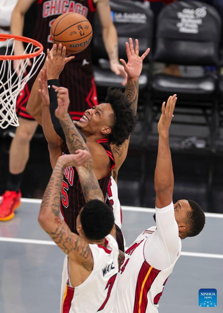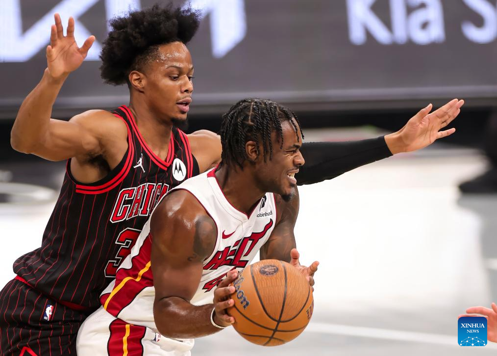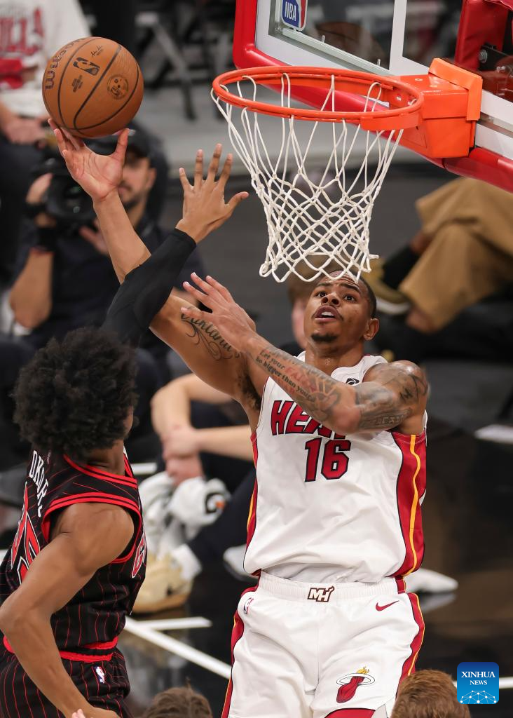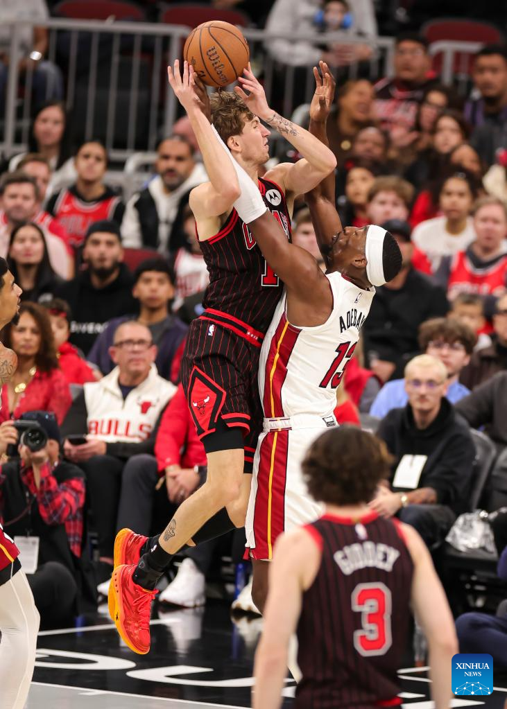 (251122) -- CHICAGO, Nov. 22, 2025 (Xinhua) -- Matas Buzelis (top) of Chicago Bulls goes to the basket against Bam Adebayo of Miami Heat during the 2025-2026 NBA Cup group match between Chicago Bulls and Miami Heat in Chicago, the United States, on Nov. 21, 2025. (Photo by Joel Lerner/Xinhua)