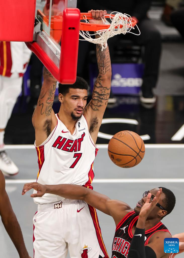(251122) -- CHICAGO, Nov. 22, 2025 (Xinhua) -- Kel'El Ware (top) of Miami Heat dunks the ball during the 2025-2026 NBA Cup group match between Chicago Bulls and Miami Heat in Chicago, the United States, on Nov. 21, 2025. (Photo by Joel Lerner/Xinhua)
