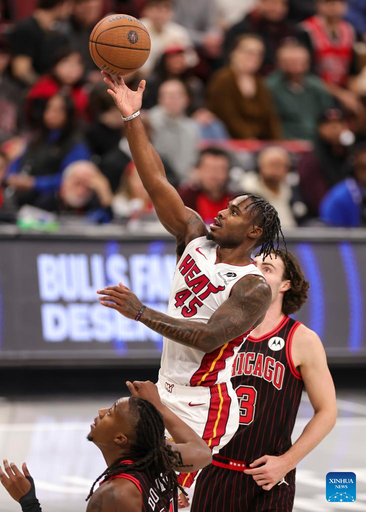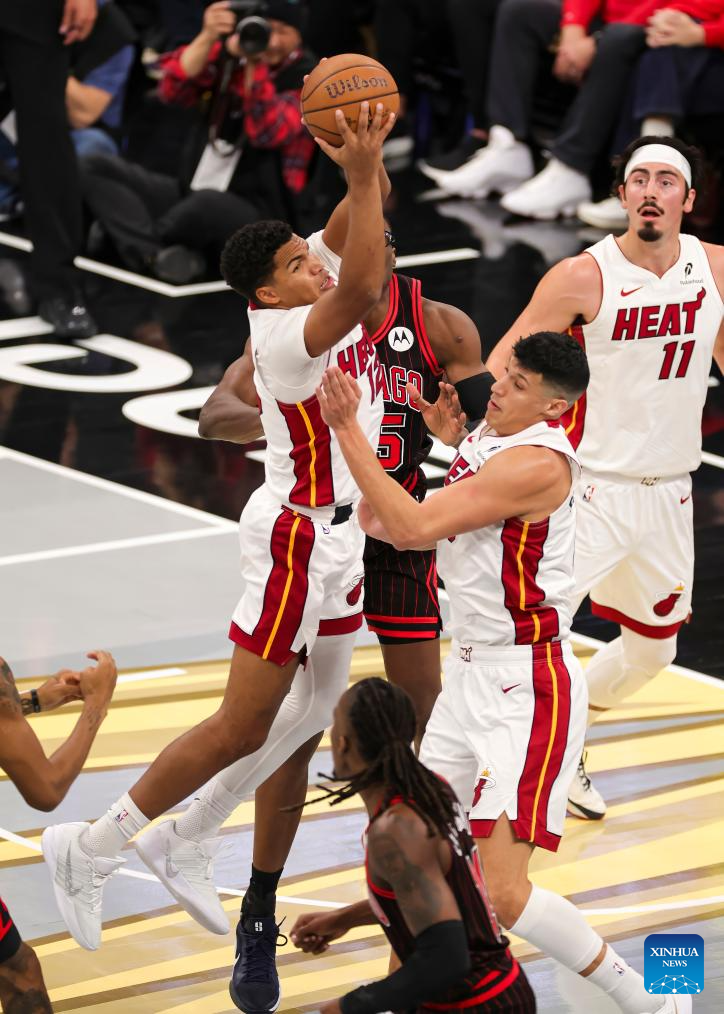 (251122) -- CHICAGO, Nov. 22, 2025 (Xinhua) -- Keshad Johnson (R) of Miami Heat shoots the ball during the 2025-2026 NBA Cup group match between Chicago Bulls and Miami Heat in Chicago, the United States, on Nov. 21, 2025. (Photo by Joel Lerner/Xinhua)
