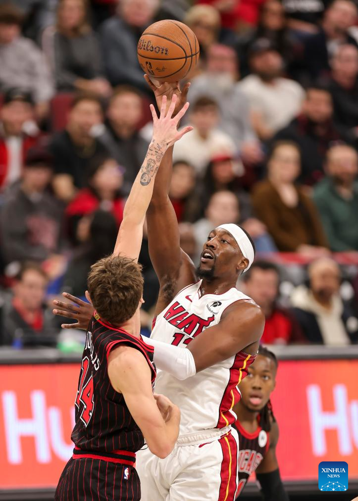 (251122) -- CHICAGO, Nov. 22, 2025 (Xinhua) -- Bam Adebayo (top) of Miami Heat shoots the ball during the 2025-2026 NBA Cup group match between Chicago Bulls and Miami Heat in Chicago, the United States, on Nov. 21, 2025. (Photo by Joel Lerner/Xinhua)