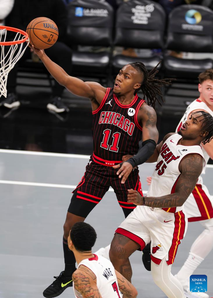 (251122) -- CHICAGO, Nov. 22, 2025 (Xinhua) -- Ayo Dosunmu (L) of Chicago Bulls drives to the basket during the 2025-2026 NBA Cup group match between Chicago Bulls and Miami Heat in Chicago, the United States, on Nov. 21, 2025. (Photo by Joel Lerner/Xinhua)