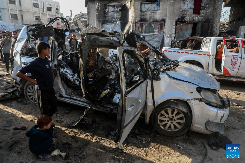 The strike, targeting a civilian vehicle near the Abbas Junction in the Rimal neighborhood, also injured several passersby and set the car on fire, eyewitnesses and medical sources told Xinhua. (Photo by Rizek Abdeljawad/Xinhua)