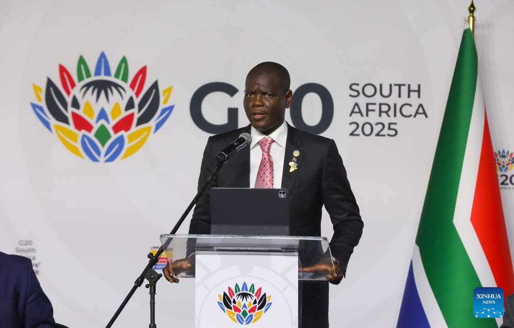 South African International Relations and Cooperation Minister Ronald Lamola speaks during a press conference in Johannesburg, South Africa, Nov. 22, 2025. World leaders at the 20th Group of 20 (G20) Summit adopted the G20 South Africa Summit's Leaders' Declaration on Saturday. The announcement of the declaration's adoption was made at the opening of the summit, the first ever held in Africa. The two-day gathering is being held in Johannesburg under the theme "Solidarity, Equality and Sustainability." The leaders' declaration reflects a shared recognition that global challenges require more coordinated and equitable approaches.(Xinhua/Chen Wei)
