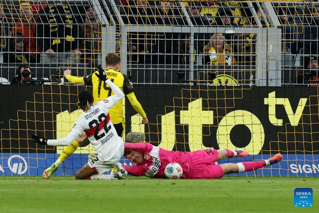 Alexander Nuebel (R), goalkeeper of VfB Stuttgart makes a save during the German first division Bundesliga football match between Borussia Dortmund and VfB Stuttgart in Dortmund, Germany, Nov. 22, 2025. (Photo by Joachim Bywaletz/Xinhua)