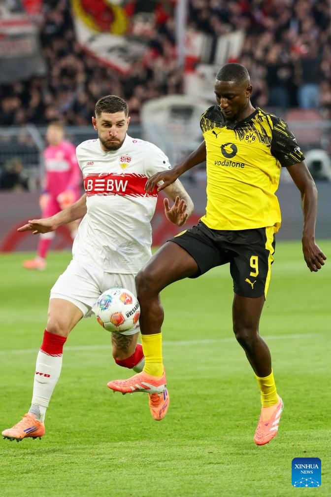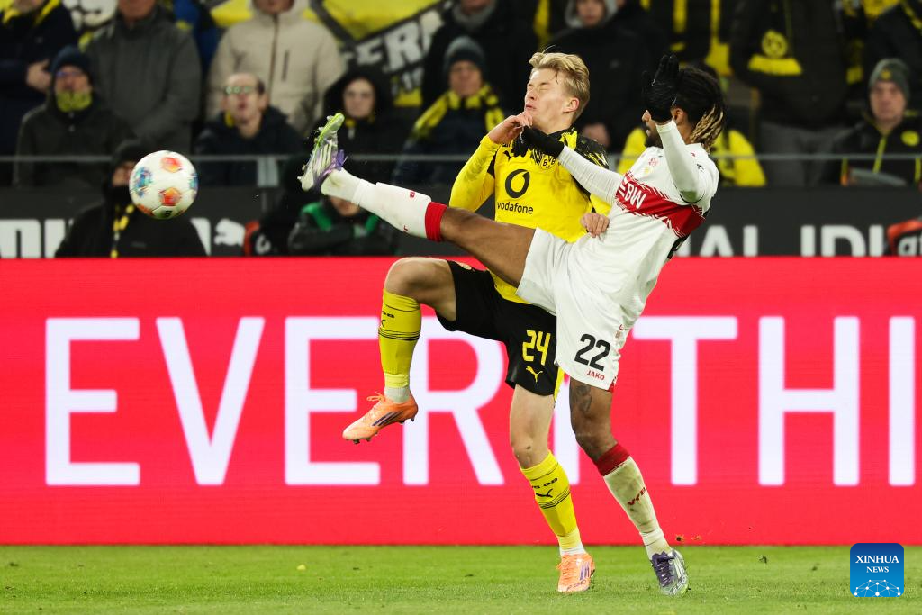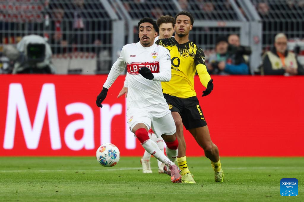Felix Nmecha (R) of Borussia Dortmund vies with Tiago Tomas of VfB Stuttgart during the German first division Bundesliga football match between Borussia Dortmund and VfB Stuttgart in Dortmund, Germany, Nov. 22, 2025. (Photo by Joachim Bywaletz/Xinhua)