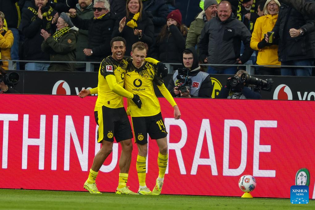 Maximilian Beier (R) of Borussia Dortmund celebrates scoring with his teammate Felix Nmecha during the German first division Bundesliga football match between Borussia Dortmund and VfB Stuttgart in Dortmund, Germany, Nov. 22, 2025. (Photo by Joachim Bywaletz/Xinhua)