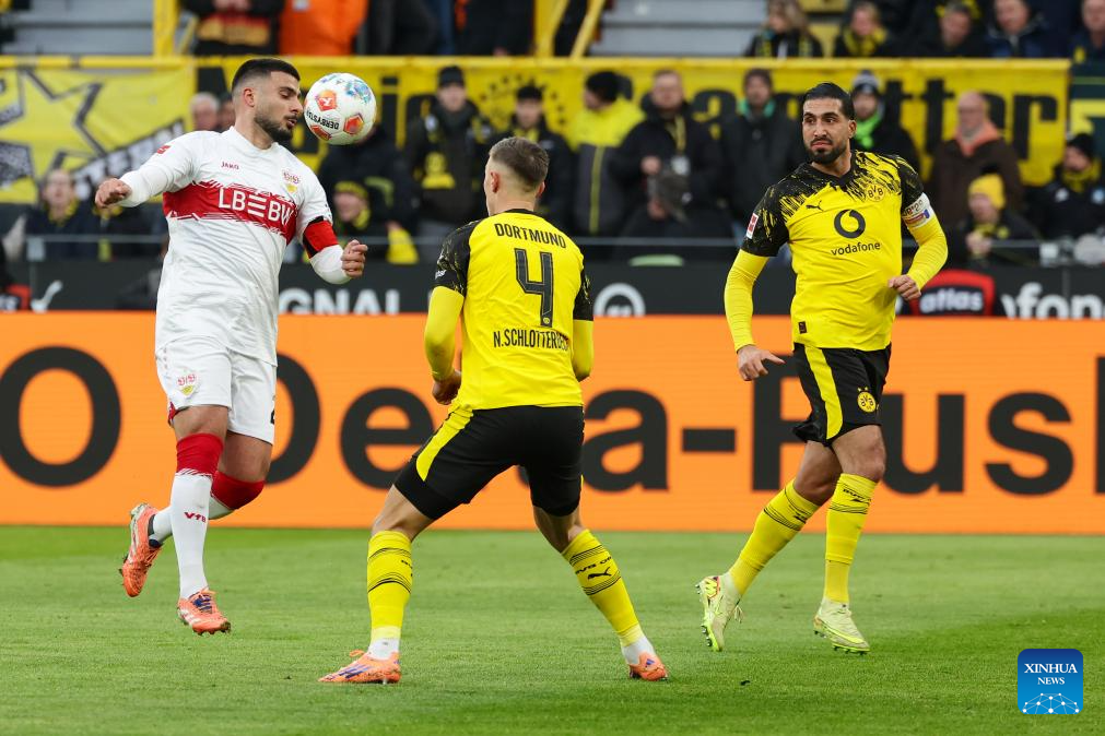 Nico Schlotterbeck (C) and Emre Can (R) of Borussia Dortmund vie with Deniz Undav of VfB Stuttgart during the German first division Bundesliga football match between Borussia Dortmund and VfB Stuttgart in Dortmund, Germany, Nov. 22, 2025. (Photo by Joachim Bywaletz/Xinhua)