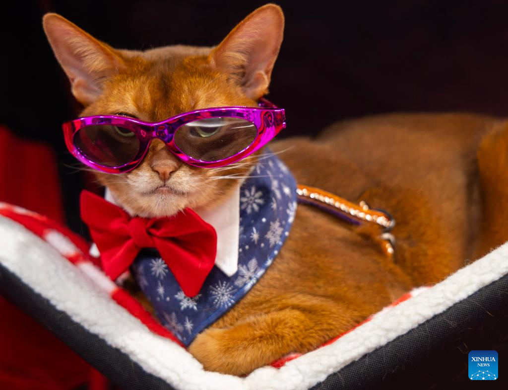 A dressed-up pet cat is seen at the 2025 Christmas Canadian Pet Expo in Mississauga, Ontario, Canada, on Nov. 22, 2025.