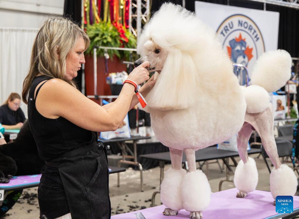 A pet groomer works on a pet dog at the 2025 Christmas Canadian Pet Expo in Mississauga, Ontario, Canada, on Nov. 22, 2025.
