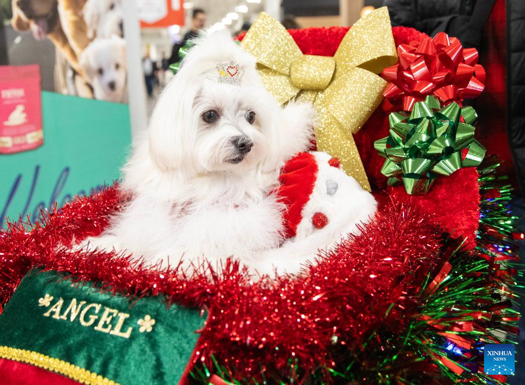 A dressed-up pet dog is seen at the 2025 Christmas Canadian Pet Expo in Mississauga, Ontario, Canada, on Nov. 22, 2025.