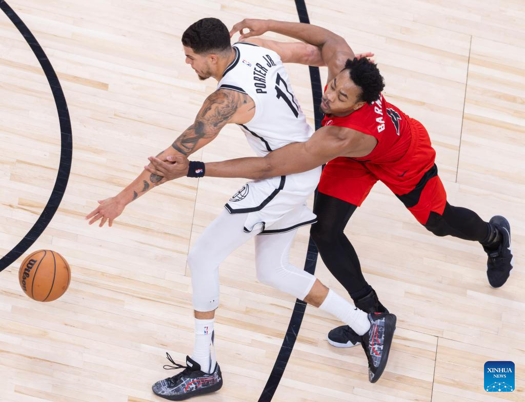 Scottie Barnes (R) of Toronto Raptors vies with Michael Porter Jr. of Brooklyn Nets during the 2025-2026 NBA regular season game between Toronto Raptors and Brooklyn Nets in Toronto, Canada, on Nov. 23, 2025. (Photo by Zou Zheng/Xinhua)