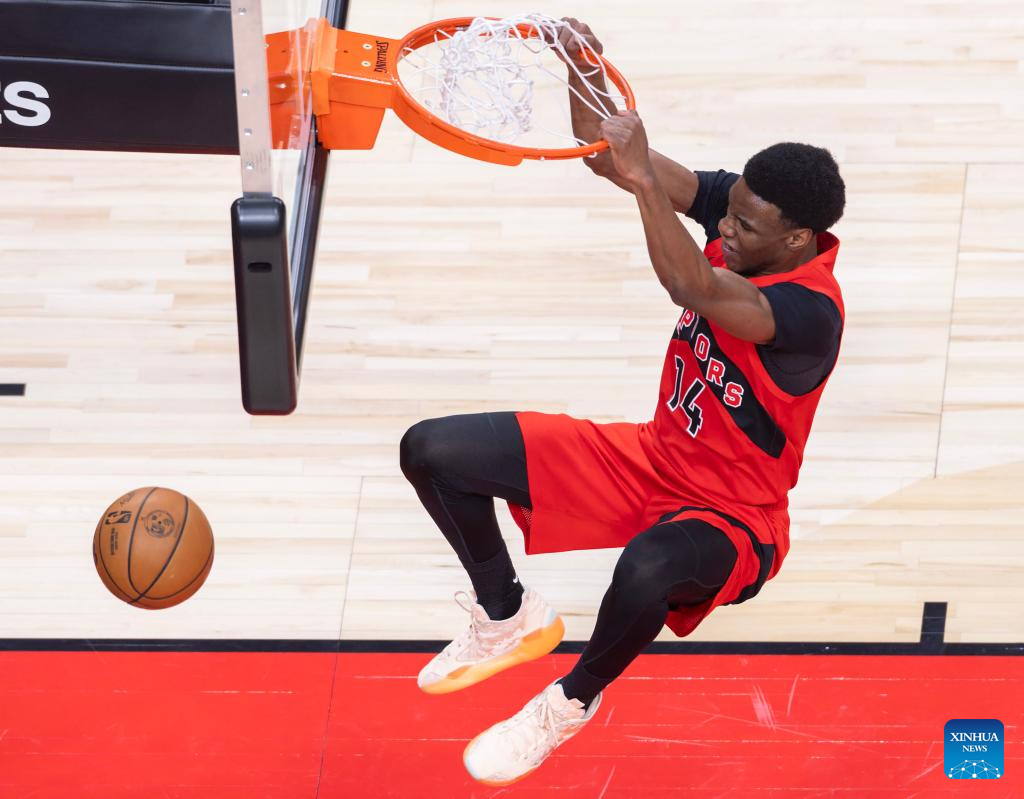 Ja'Kobe Walter of Toronto Raptors dunks during the 2025-2026 NBA regular season game between Toronto Raptors and Brooklyn Nets in Toronto, Canada, on Nov. 23, 2025. (Photo by Zou Zheng/Xinhua)