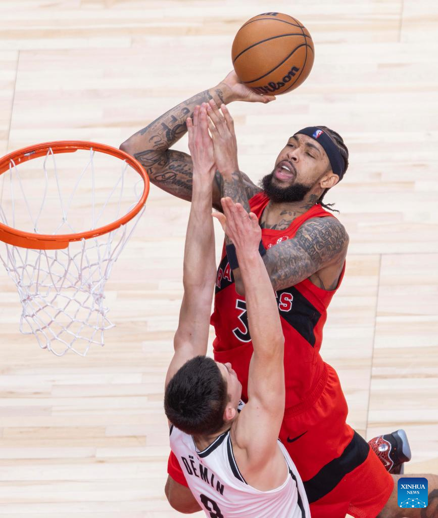 Brandon Ingram (R) of Toronto Raptors goes for a layup during the 2025-2026 NBA regular season game between Toronto Raptors and Brooklyn Nets in Toronto, Canada, on Nov. 23, 2025. (Photo by Zou Zheng/Xinhua)