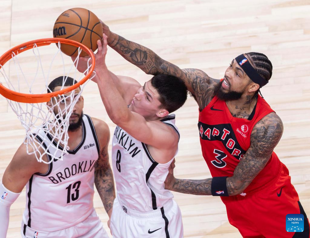Noah Clowney (2nd R) of Brooklyn Nets makes a jump hook shot during the 2025-2026 NBA regular season game between Toronto Raptors and Brooklyn Nets in Toronto, Canada, on Nov. 23, 2025. (Photo by Zou Zheng/Xinhua)