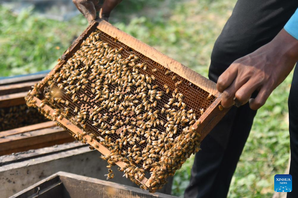 A beekeeper examines a honeycomb from a beehive at a honeybee farm in Mayong village in Morigaon district of India's northeastern state of Assam, Nov. 23, 2025. (Str/Xinhua)