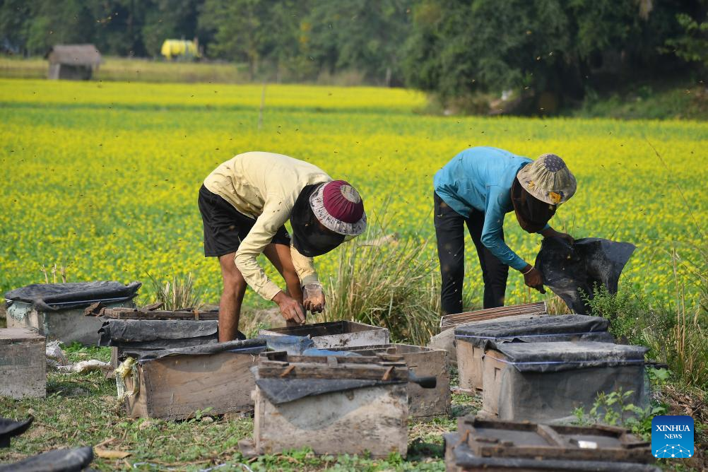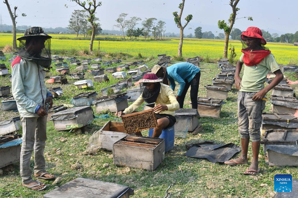 Beekeepers examine honeycombs from a beehive at a honeybee farm in Mayong village in Morigaon district of India's northeastern state of Assam, Nov. 23, 2025. (Str/Xinhua)