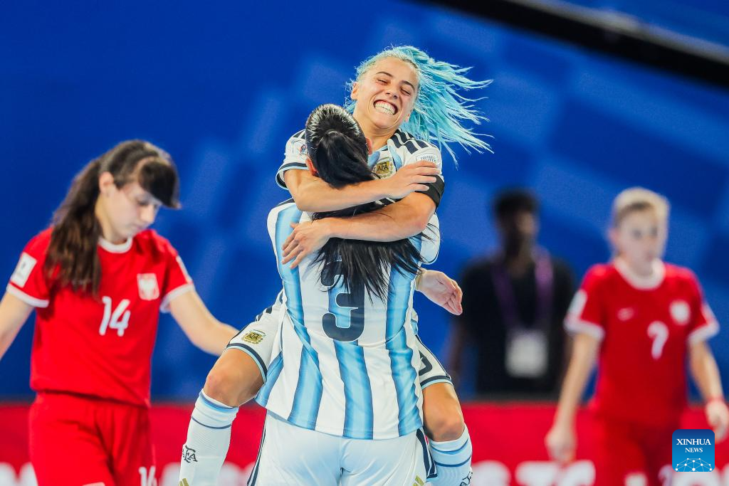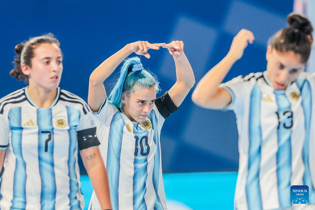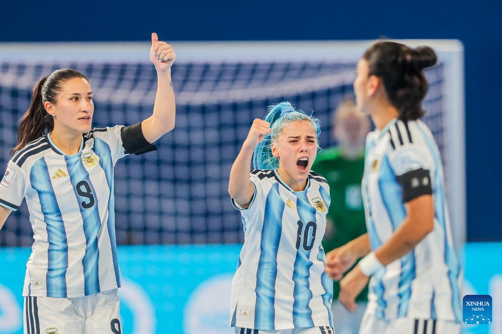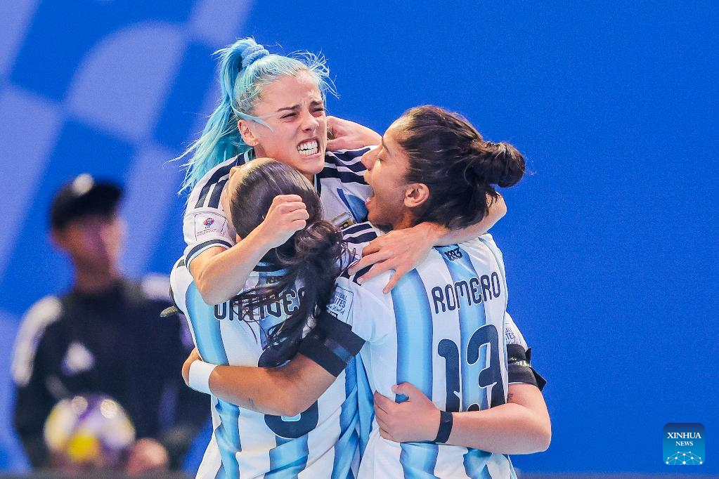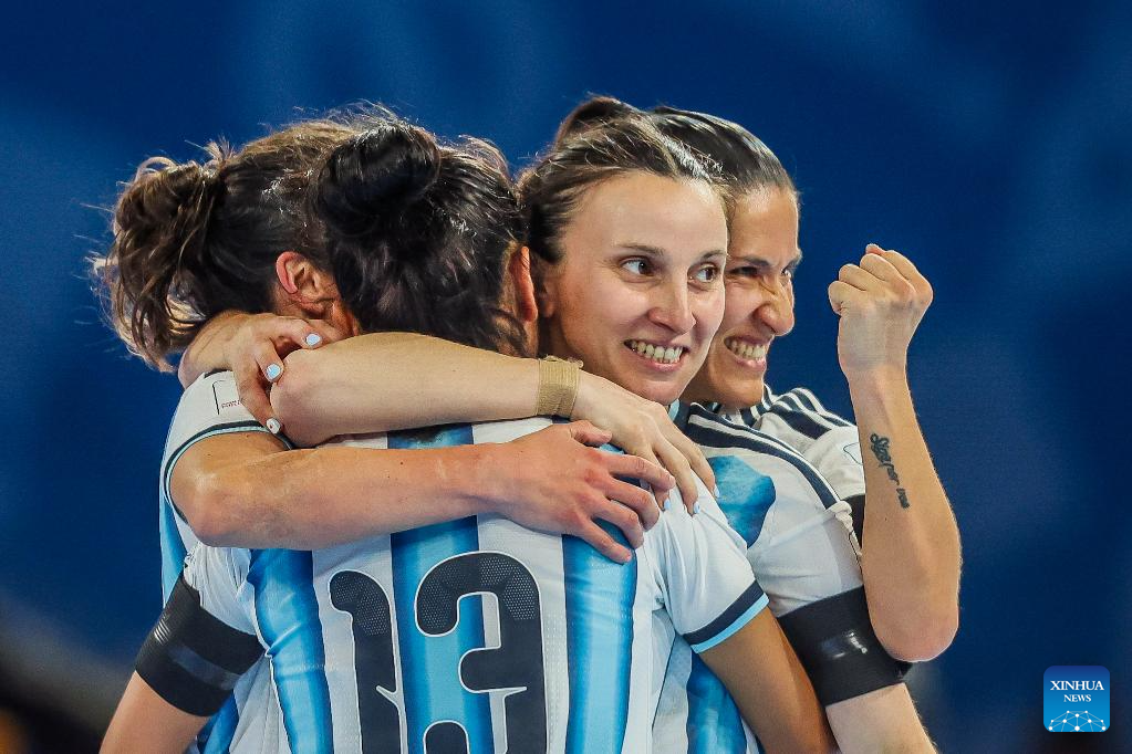 Players of Argentina celebrate after scoring a goal during the group A match between Argentina and Poland at the FIFA Futsal Women's World Cup 2025 in Pasig City, the Philippines, Nov. 24, 2025. (Xinhua/Rouelle Umali)