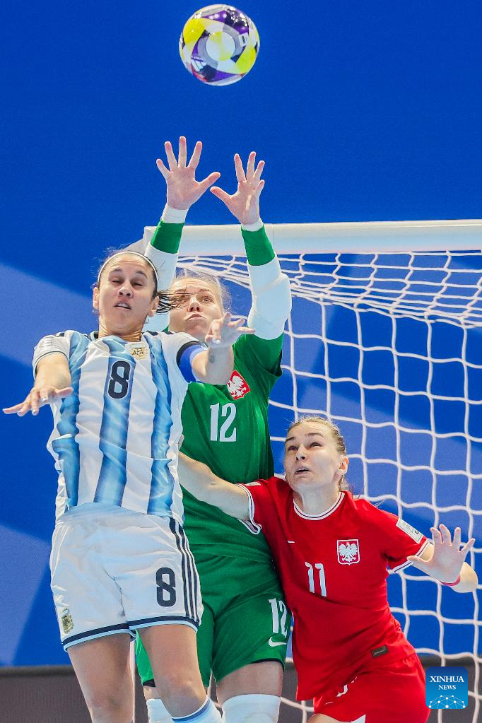 Karina Nunez (L) of Argentina competes against Natalia Majewska (C) and Wiktoria Pietrzyk of Poland during the group A match between Argentina and Poland at the FIFA Futsal Women's World Cup 2025 in Pasig City, the Philippines, Nov. 24, 2025. (Xinhua/Rouelle Umali)