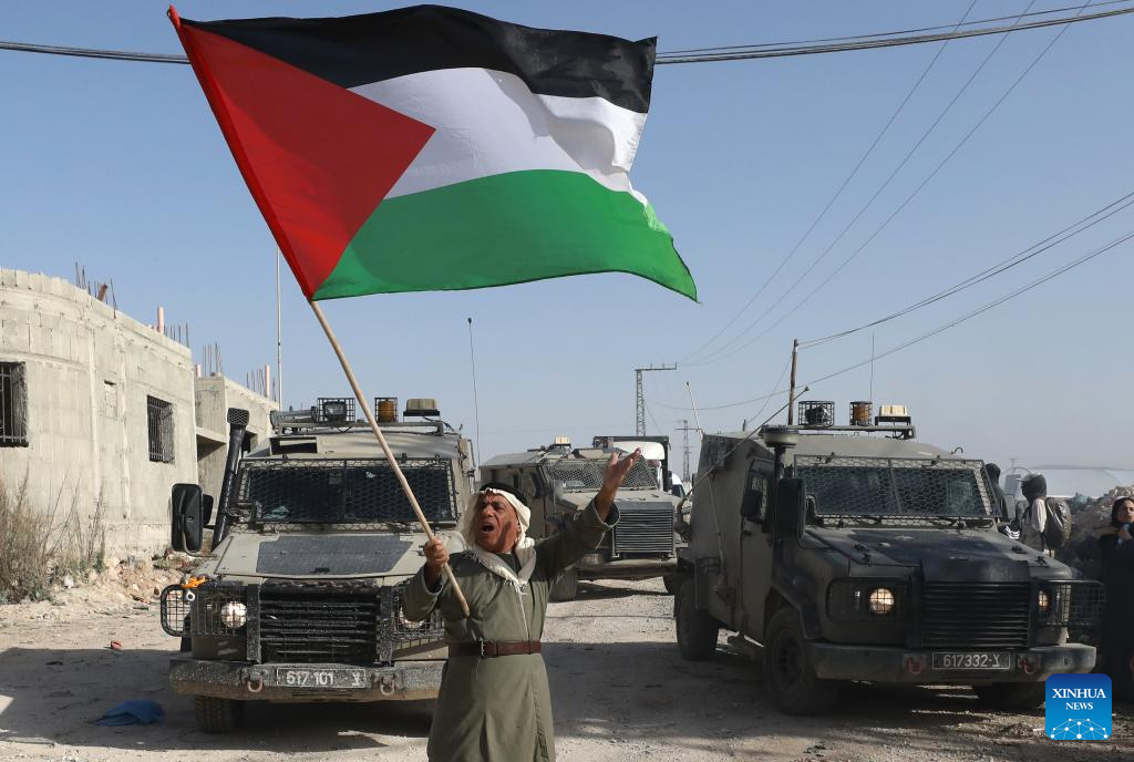 A Palestinian man demonstrates demanding to return to Nur Shams camp, east of Tulkarm city, in the northern West Bank, on Nov. 23, 2025. Dozens of displaced people from Nur Shams camp gathered here to demand return to their homes. (Photo by Nidal Eshtayeh/Xinhua)