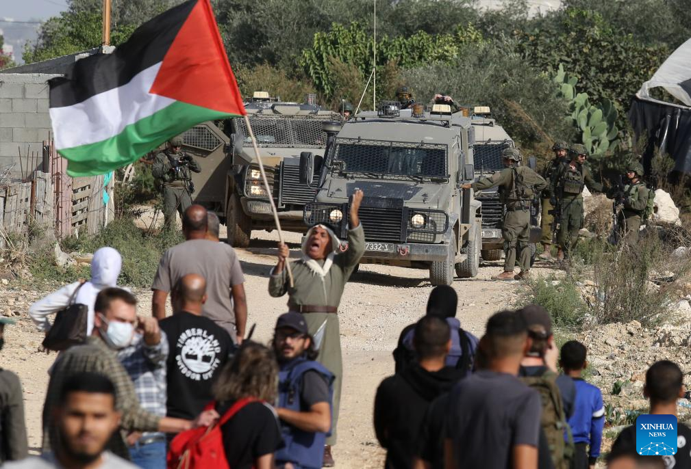 Palestinians demonstrate demanding to return to Nur Shams camp, east of Tulkarm city, in the northern West Bank, on Nov. 23, 2025. Dozens of displaced people from Nur Shams camp gathered here to demand return to their homes. (Photo by Nidal Eshtayeh/Xinhua)