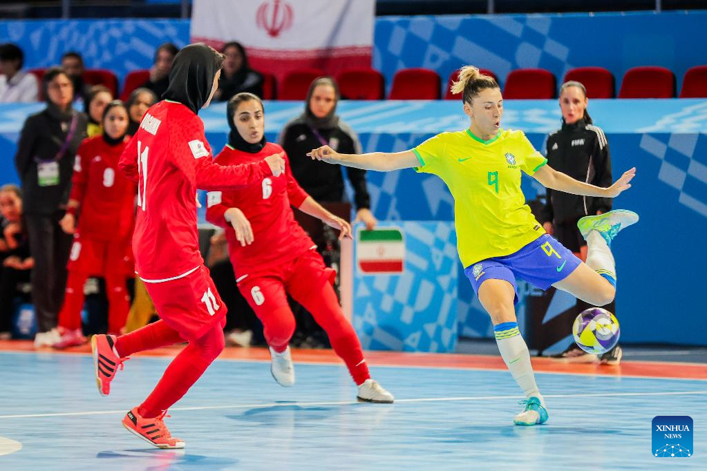 Emilly (1st R) of Brazil competes during the group D match between Brazil and Iran at the FIFA Futsal Women's World Cup 2025 in Pasig City, the Philippines, Nov. 23, 2025. (Xinhua/Rouelle Umali)
