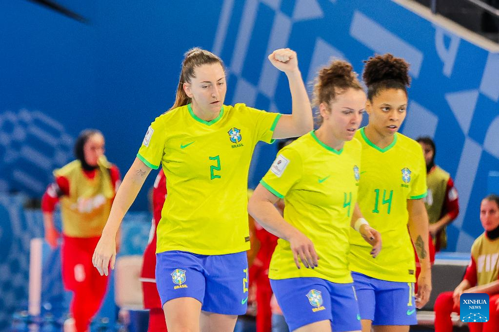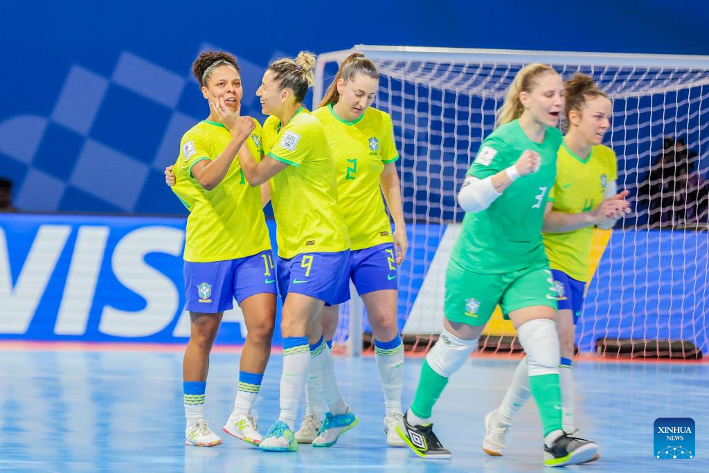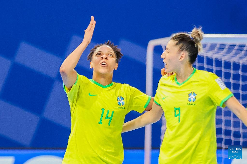 Players of Brazil celebrate after scoring a goal during the group D match between Brazil and Iran at the FIFA Futsal Women's World Cup 2025 in Pasig City, the Philippines, Nov. 23, 2025. (Xinhua/Rouelle Umali)