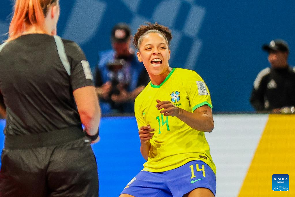 Ana Luiza of Brazil celebrates after scoring a goal during the group D match between Brazil and Iran at the FIFA Futsal Women's World Cup 2025 in Pasig City, the Philippines, Nov. 23, 2025. (Xinhua/Rouelle Umali)