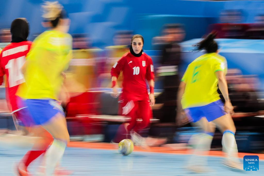 Nasimeh Gholami (C) of Iran competes during the group D match between Brazil and Iran at the FIFA Futsal Women's World Cup 2025 in Pasig City, the Philippines, Nov. 23, 2025. (Xinhua/Rouelle Umali)